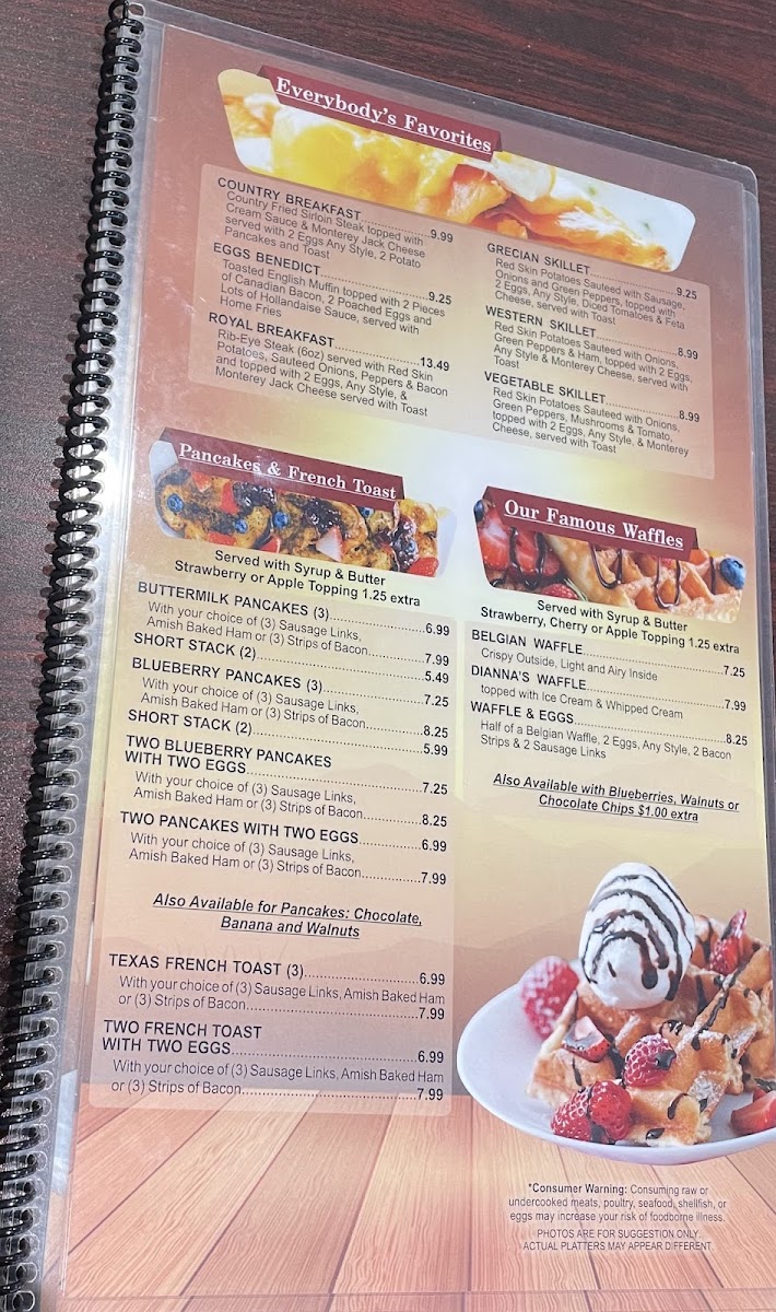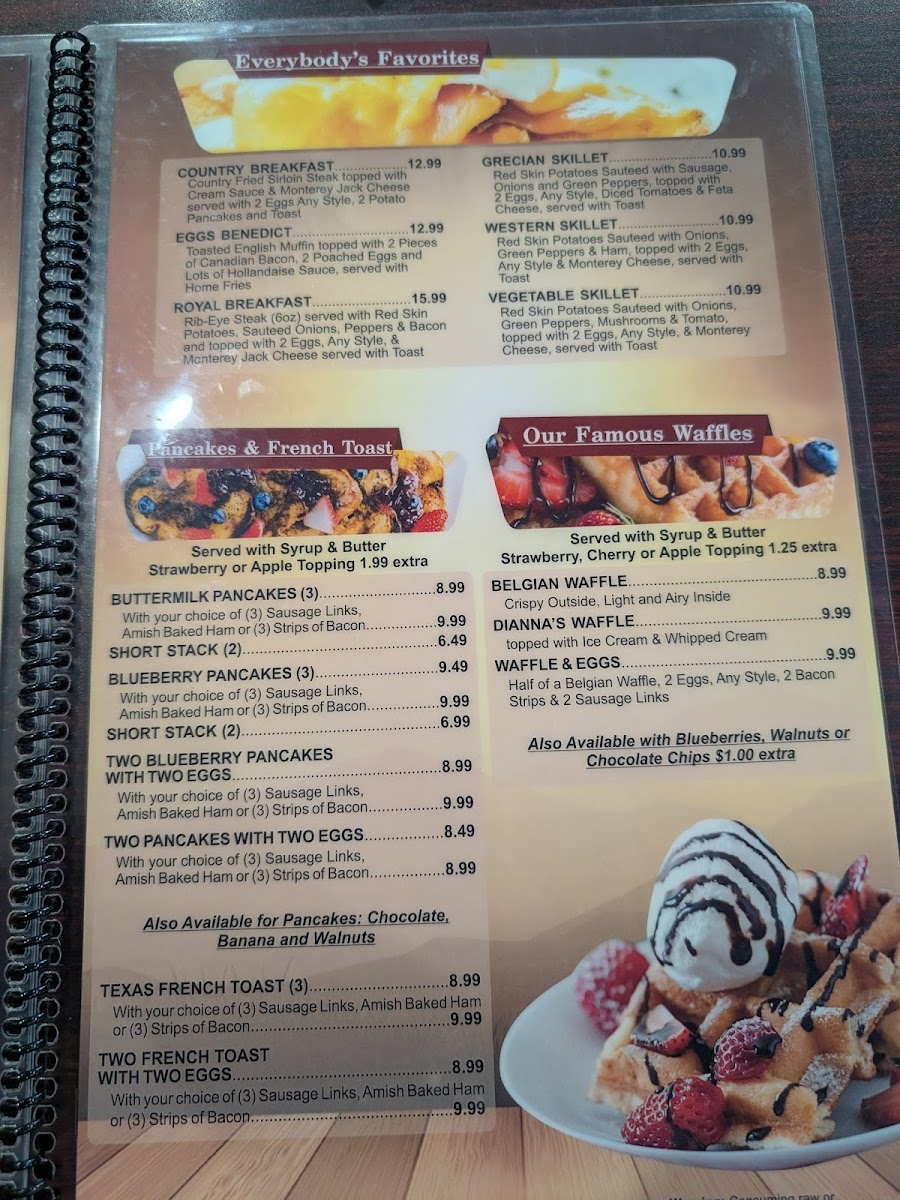 Welcome to Dianna's Deli & Restaurant, a beloved culinary gem nestled in Sandusky, OH, offering an inviting atmosphere and a diverse menu that caters to all tastes. Start your day with one of their all-day omelettes, like the hearty Western Omelette or the flavorful Deli Omelette, each paired with home fries and toast for an authentic diner feel. Seafood lovers will delight in entrées like the Beer Buttered Scrod and Breaded Walleye Pike, perfectly fried to a golden brown. Don’t forget to save room for dessert; the Gourmet Cheesecake and Carrot Cake are a must-try, capturing the essence of homemade sweetness.